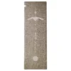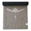 Jute udgør yogamåttens mocca farvede skridsikre overside med print af “The Shooting Bow”. Bagsiden består af smuk grafit farvet naturgummi, der holder yogamåtten fast på underlaget.