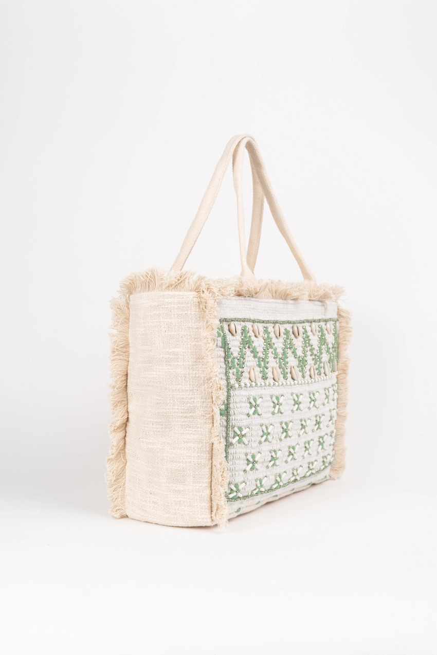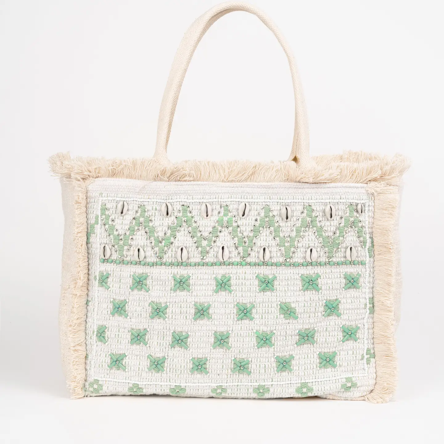 Den lette og søde taske er et friskt og sommerligt valg, perfekt til hverdag eller en dag på stranden. Designet har livlige blå nuancer, der skaber glæde og lys, mens perler og muslingeskaller tilfører et bohemeagtigt og tiltalende præg.