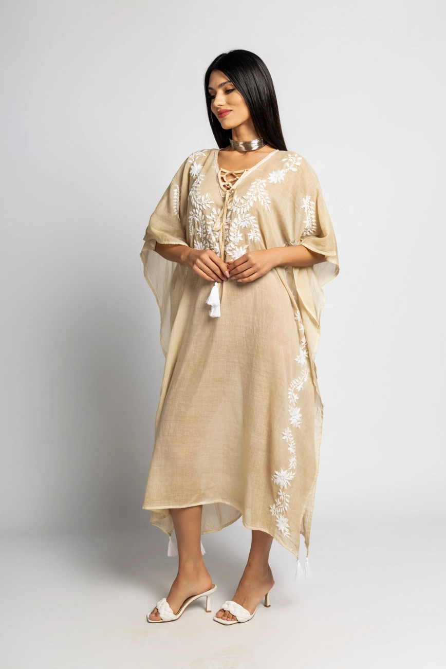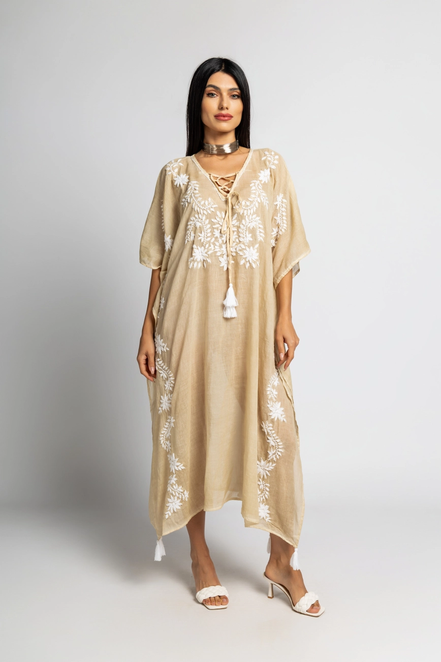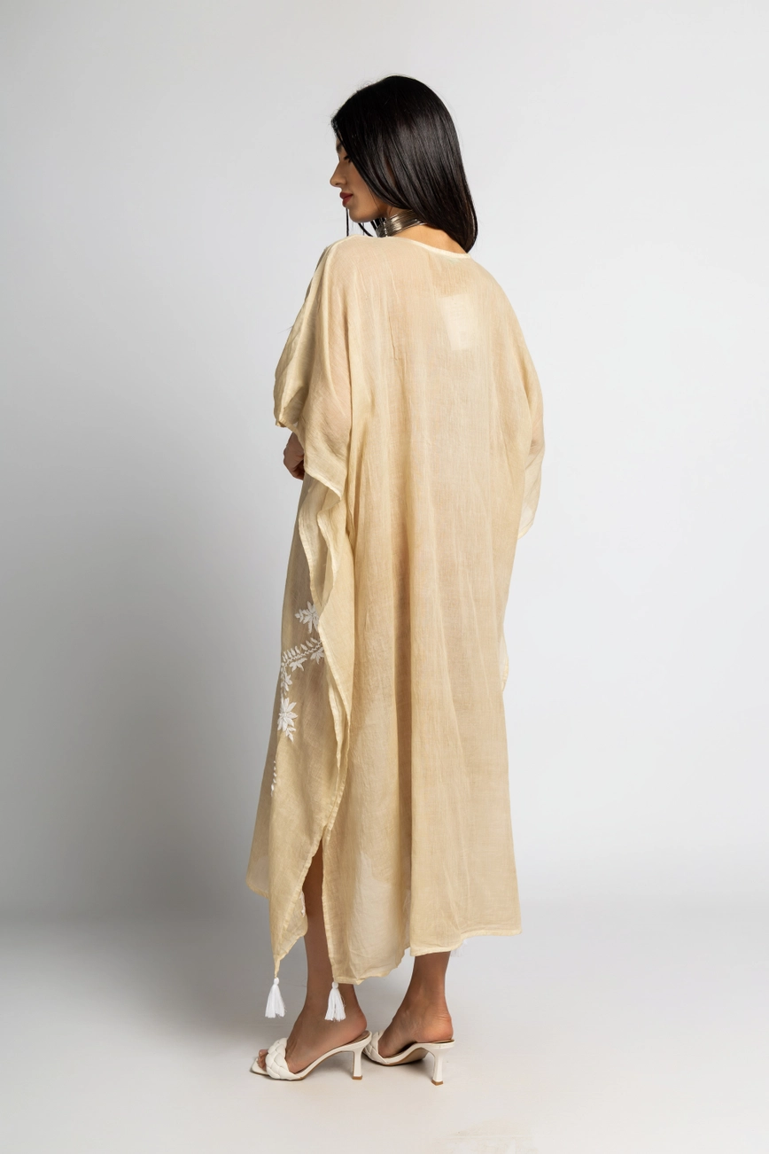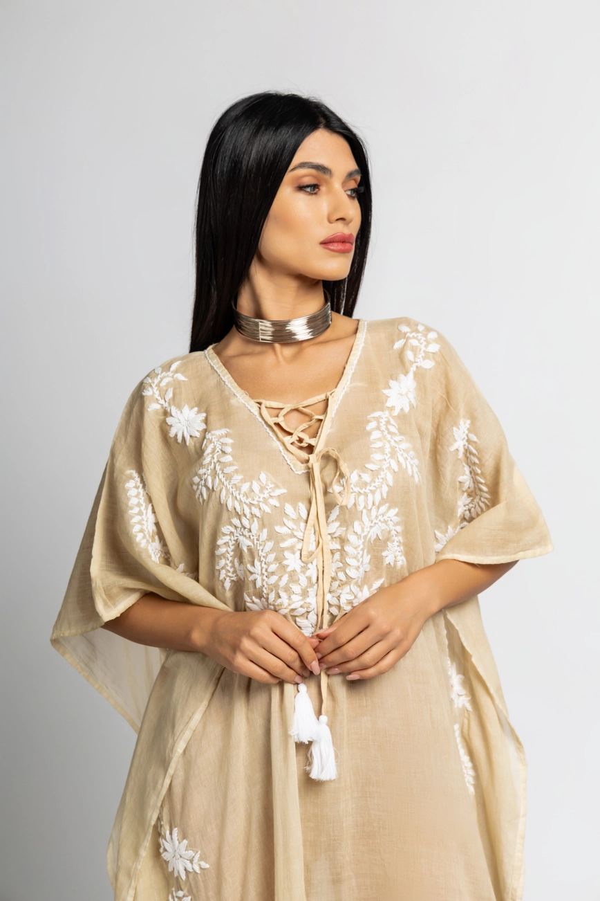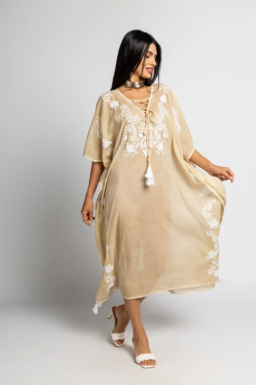 Denne lange strandkaftan emmer af ro, varme og bohemefrihed. Den bløde beige bomuld danner en smuk base for de fine hvide broderier, som tilføjer et feminint og håndlavet udtryk.