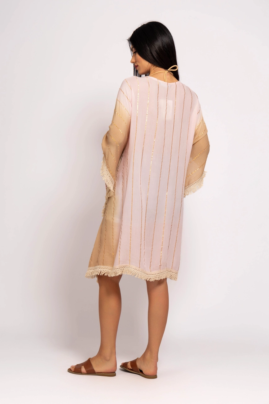 De bløde frynser langs kanterne og det løse, åbne design giver et afslappet boheme-look, mens bindebåndet i taljen gør det nemt at style kimonoen, som du ønsker – åben, løst eller let markeret i livet.