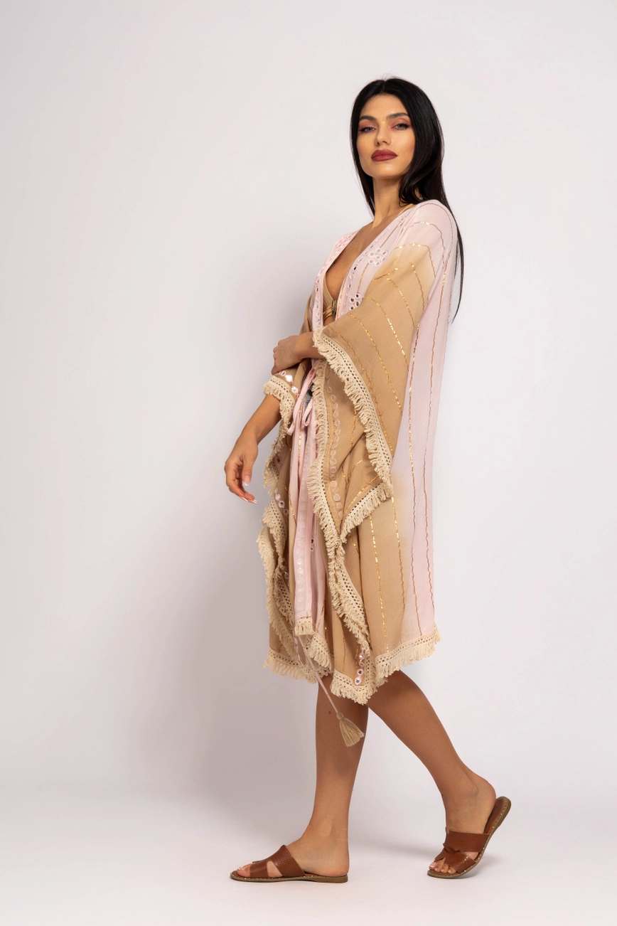 Denne smukke korte kimono er et lille kunstværk i sig selv. Det bløde bomuldsstof er dekoreret med fine broderier og små spejldetaljer, som fanger lyset og skaber et subtilt, magisk spil i bevægelse.