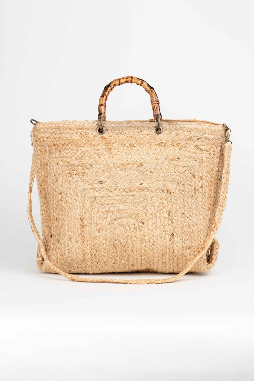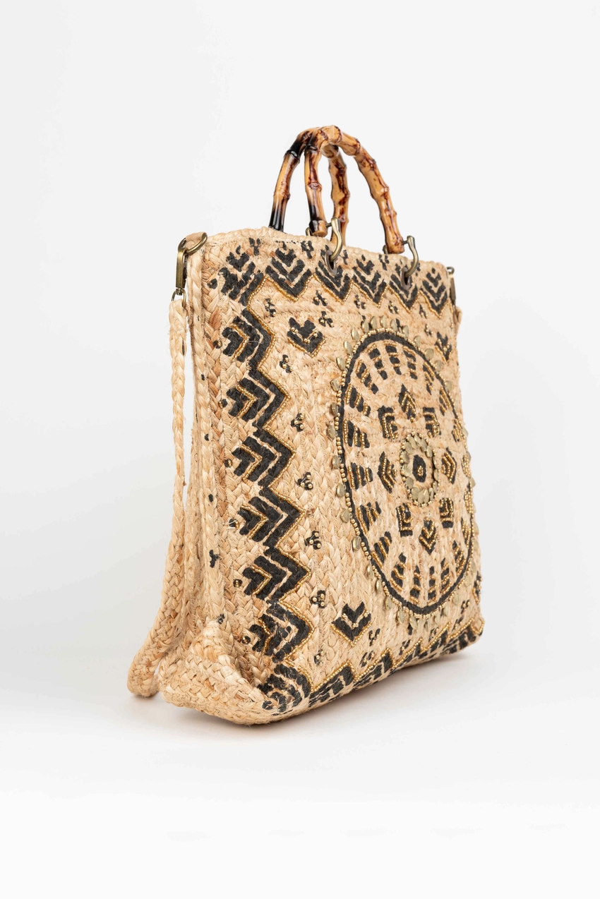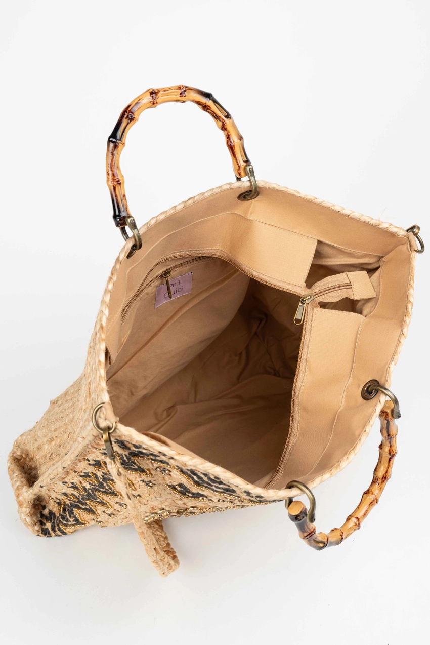 Perfekt både i byen og på stranden. Taskens rummelige størrelse gør det muligt at have alt med til en dag på jobbet eller en dag på stranden med sol og sand. De sorte og gyldne detaljer giver et elegant og sofistikeret udtryk, mens bambushåndtaget gør tasken unik og særlig.