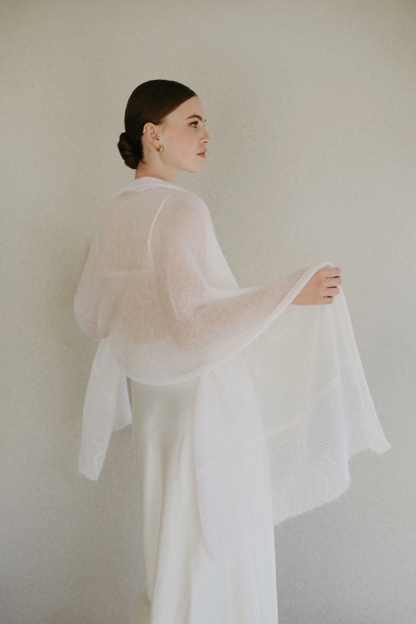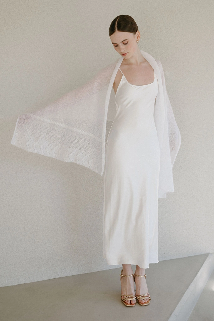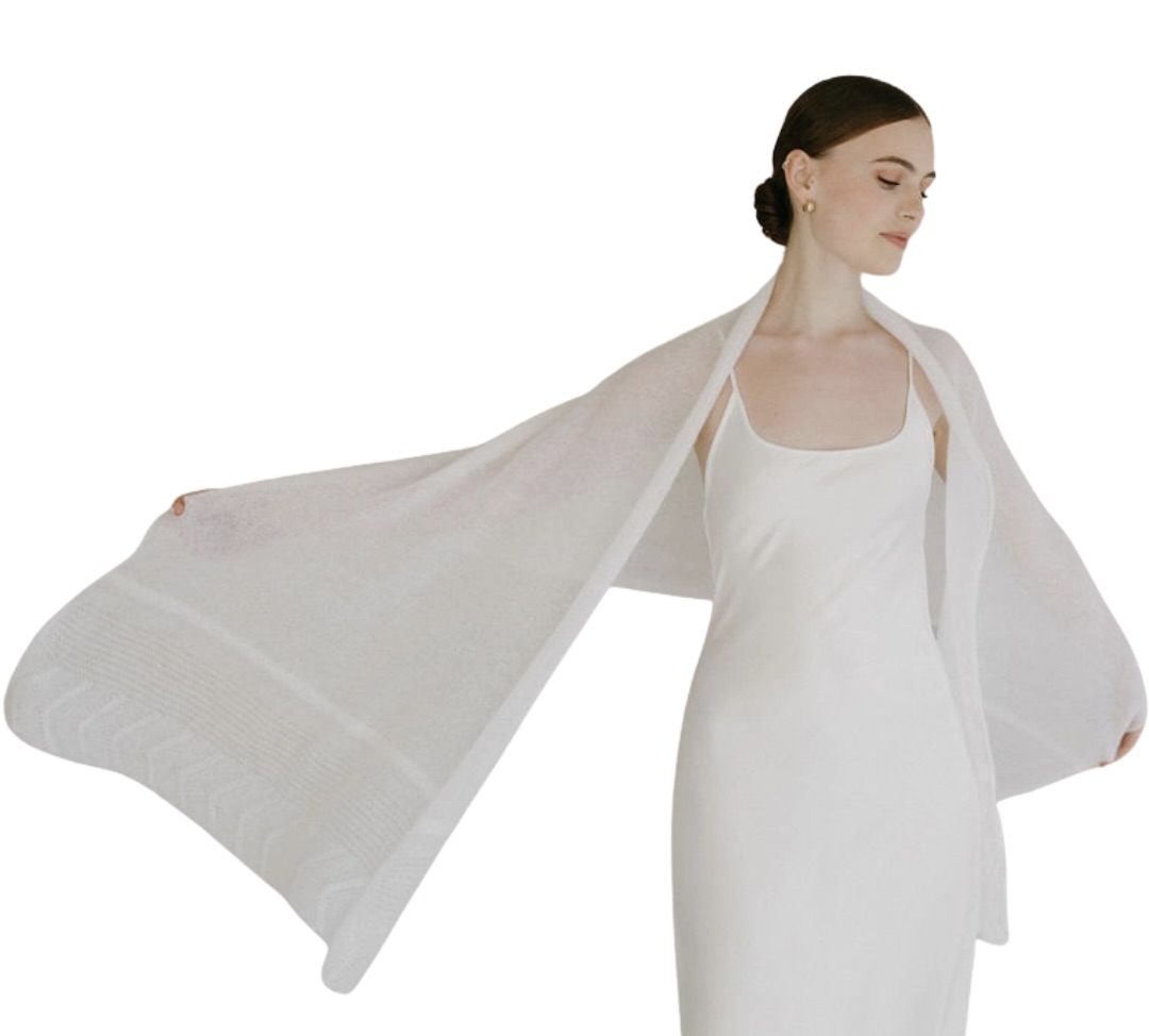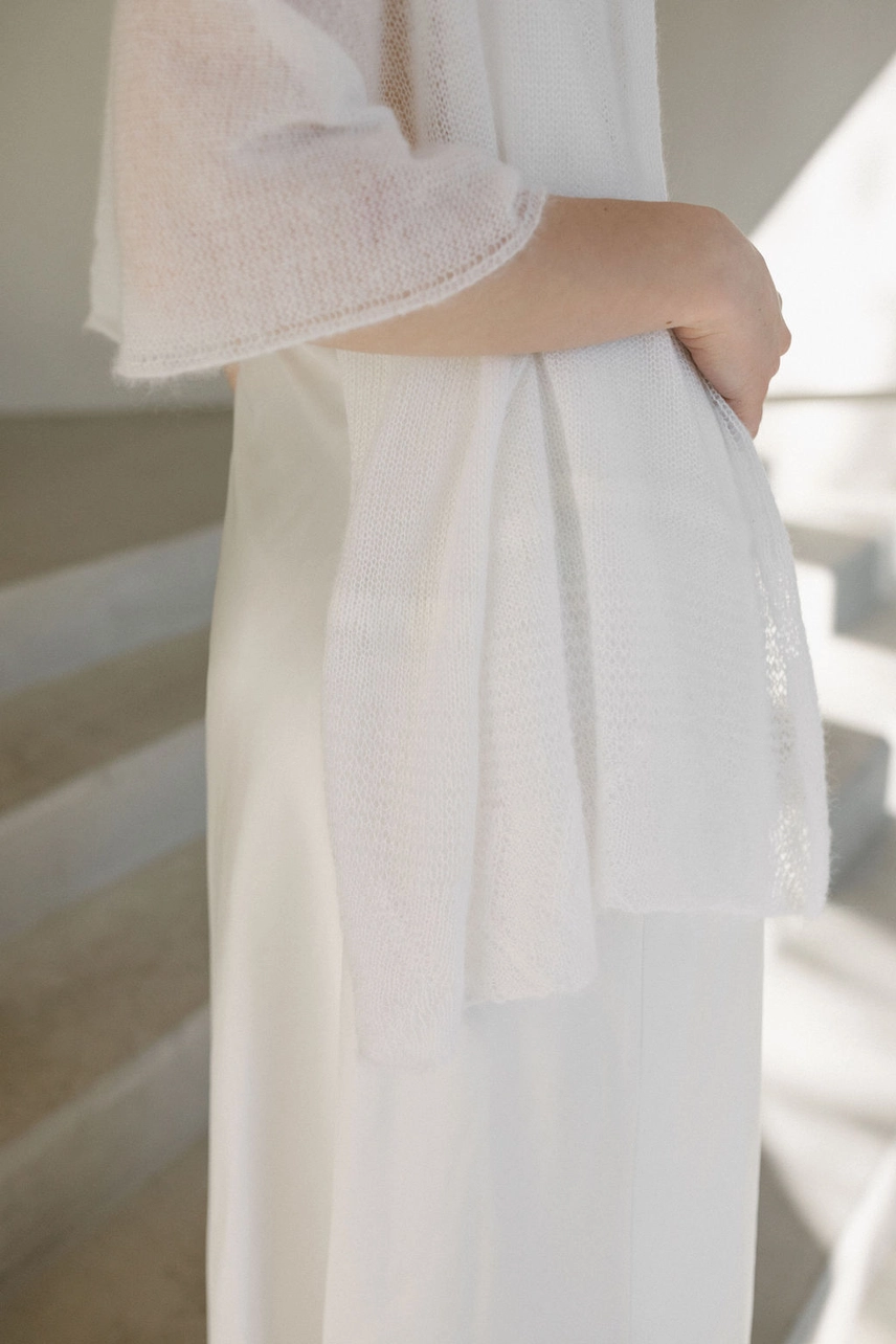 Det håndstrikkede tørklæde er lavet af næsten vægtløst superkid mohair, som bevæger sig smukt og let med din krop. Superkid mohair er utrolig blødt mod huden, og klæder enhver stil og kjole.