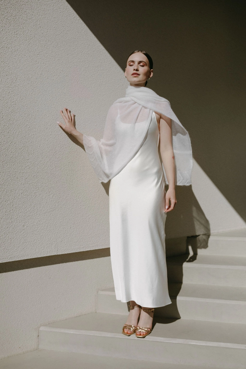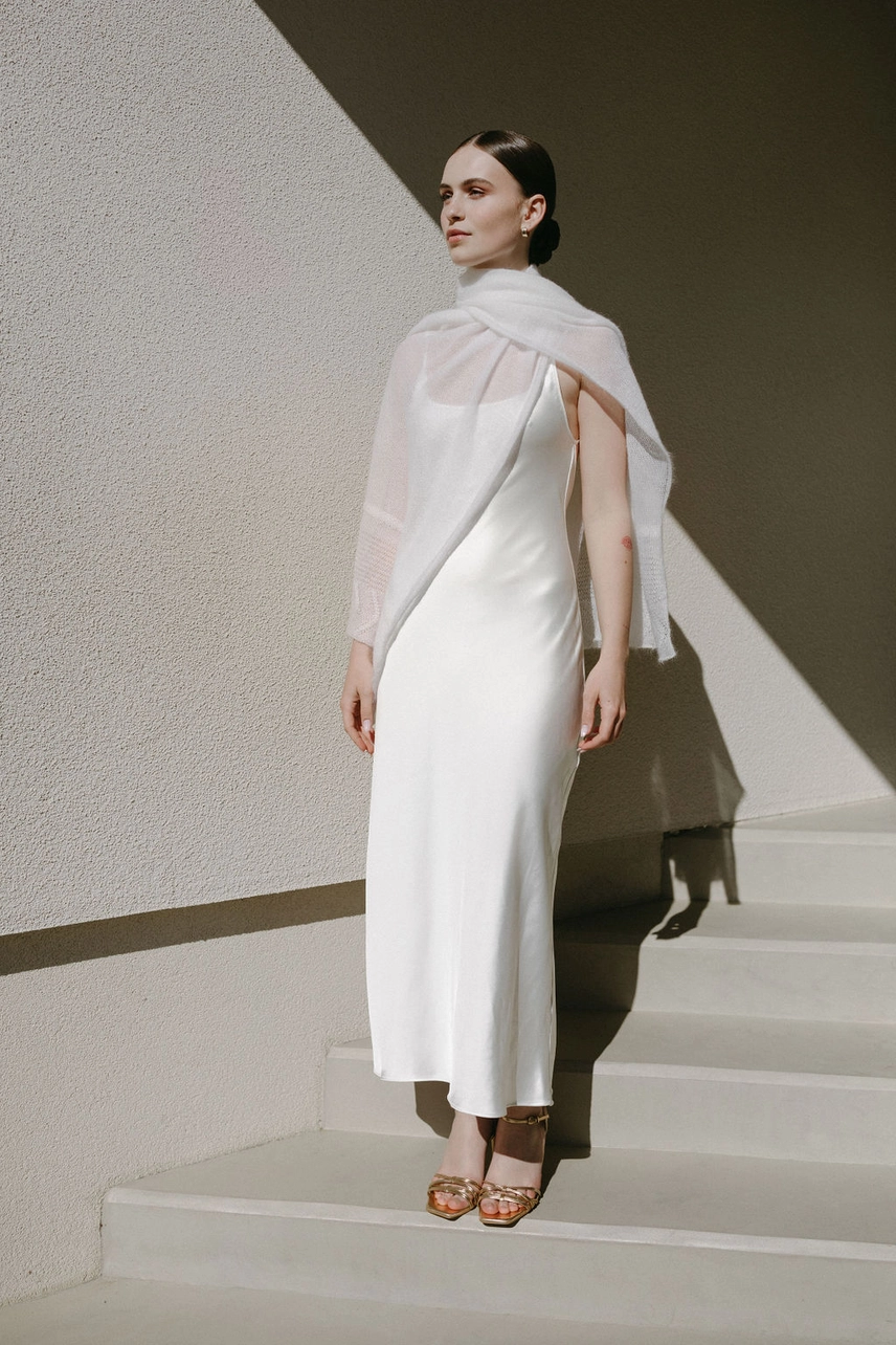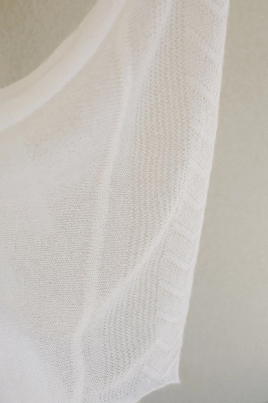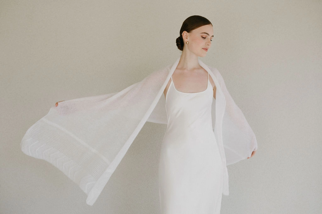 Det håndstrikkede tørklæde er lavet af næsten vægtløst superkid mohair, som bevæger sig smukt og let med din krop. Superkid mohair er utrolig blødt mod huden, og klæder enhver stil og kjole.