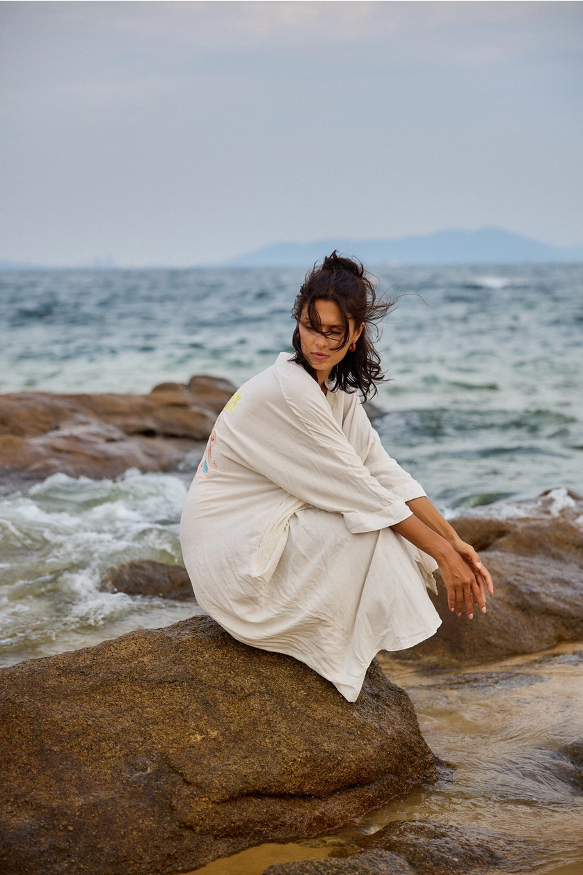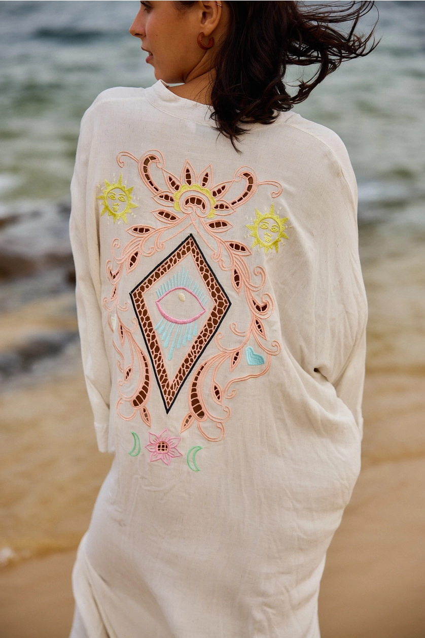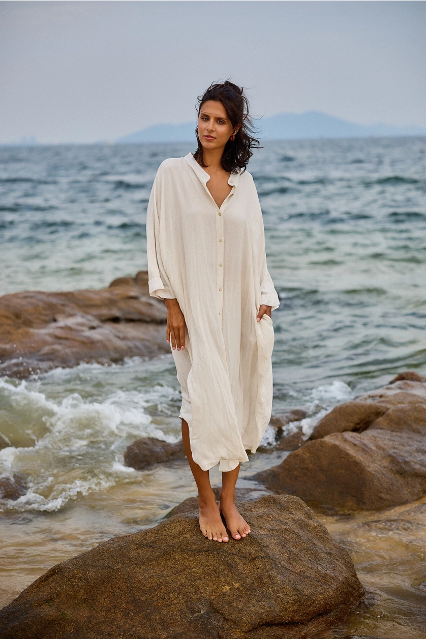 Denne elegante, lange skjortekjole emmer af lethed og boheme-inspiration. Den er designet i en løs, afslappet pasform, der falder smukt og naturligt omkring kroppen, og gør den både komfortabel og stilfuld – perfekt til varme dage ved stranden eller som et feminint hverdagslook.