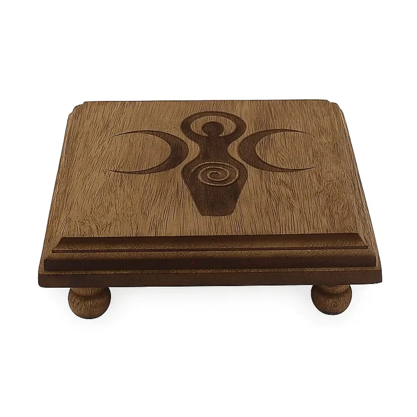 Skab et smukt og meningsfuldt ritualrum med dette mini alterbord med gudindesymbol. Det varme træ, de bløde former og det indgraverede gudindemotiv udstråler ro, balance og feminin kraft – perfekt til meditation, intentioner og daglige ritualer.