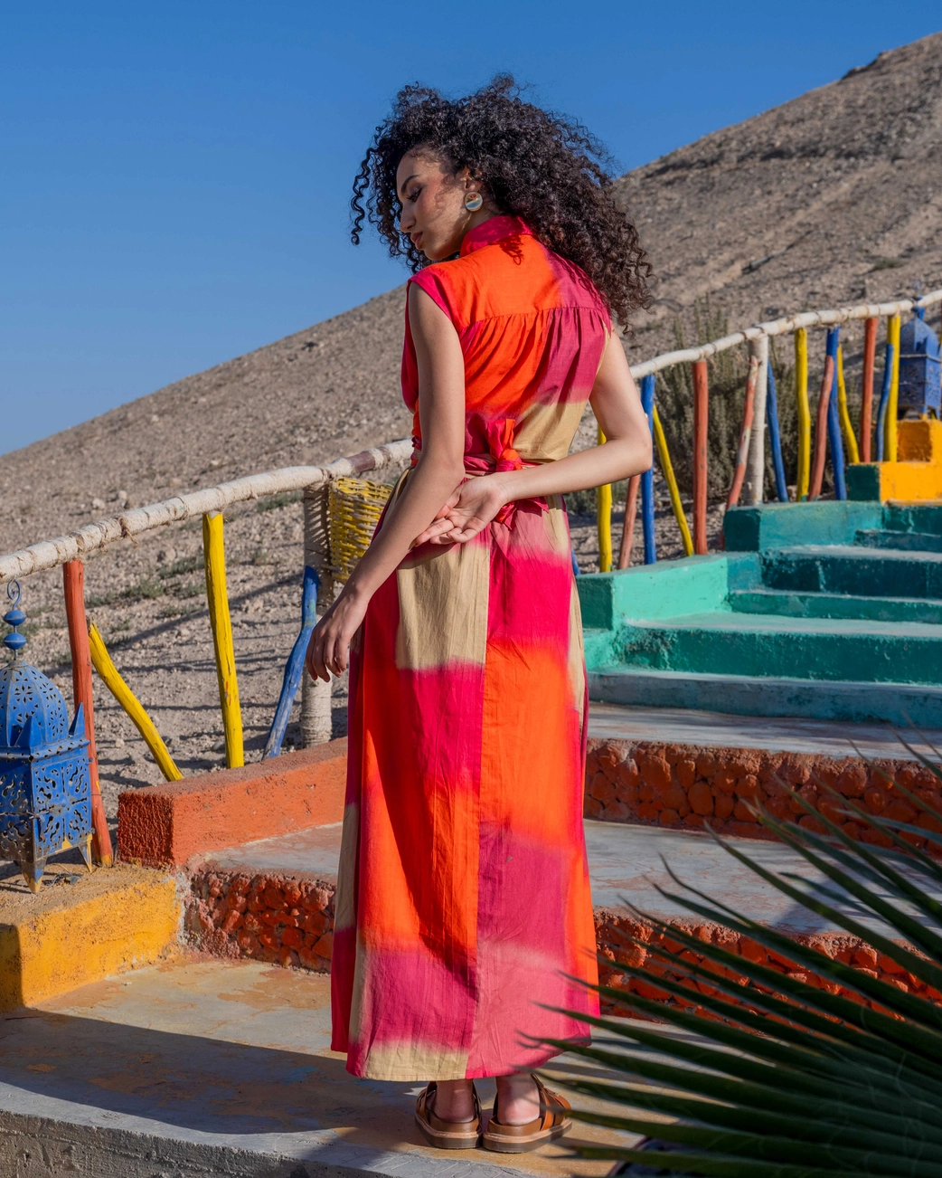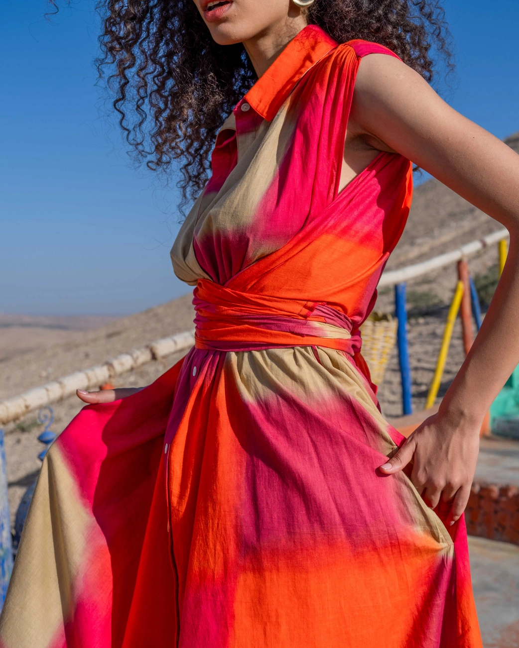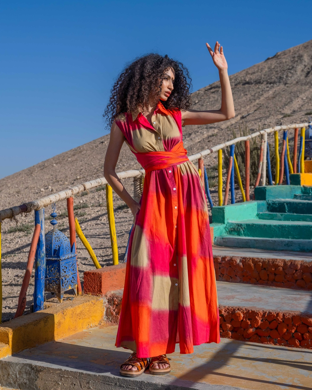 Denne lange maxikjole kombinerer et afslappet, boheme udtryk med en moderne skjortesilhuet. De varme nuancer af rød, orange og sand smelter sammen i et levende farvespil, der emmer af sol, varme og jordforbindelse.